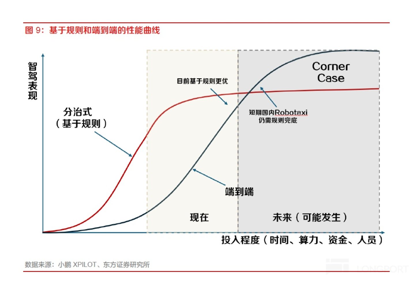 规则式方法是靠类似打补丁的方法去写场景,所以在智驾能力的提升上只能线性推进,难以再实现技术端有质的飞跃,而靠数据驱动的端到端模型依靠数据驱动有望实现类似Chatgpt的进步, 实现scaling law。
