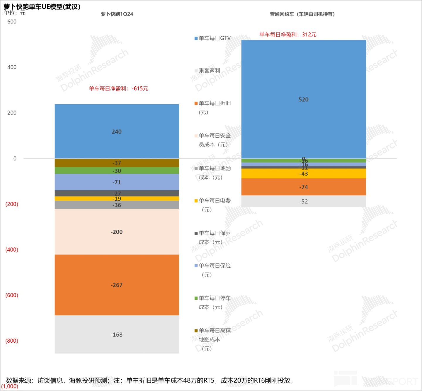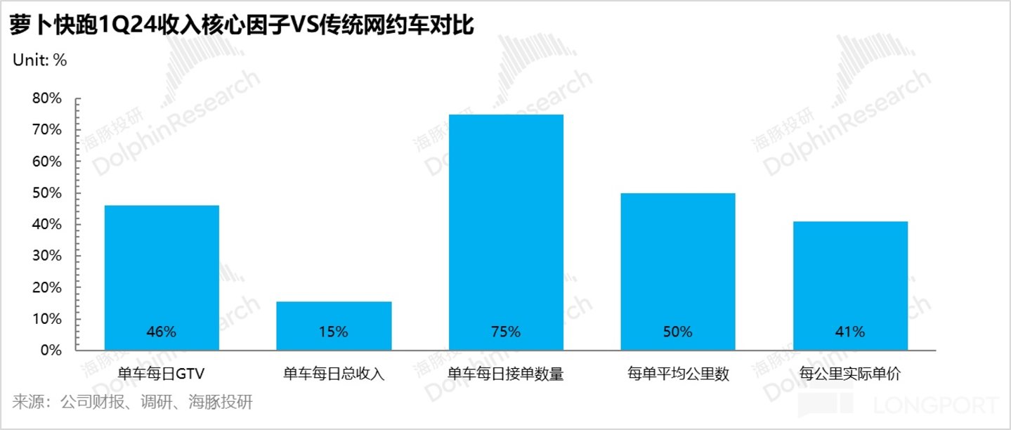① 每日总收入:萝卜快跑1Q24单车每日总收入仅为传统网约车的15%
