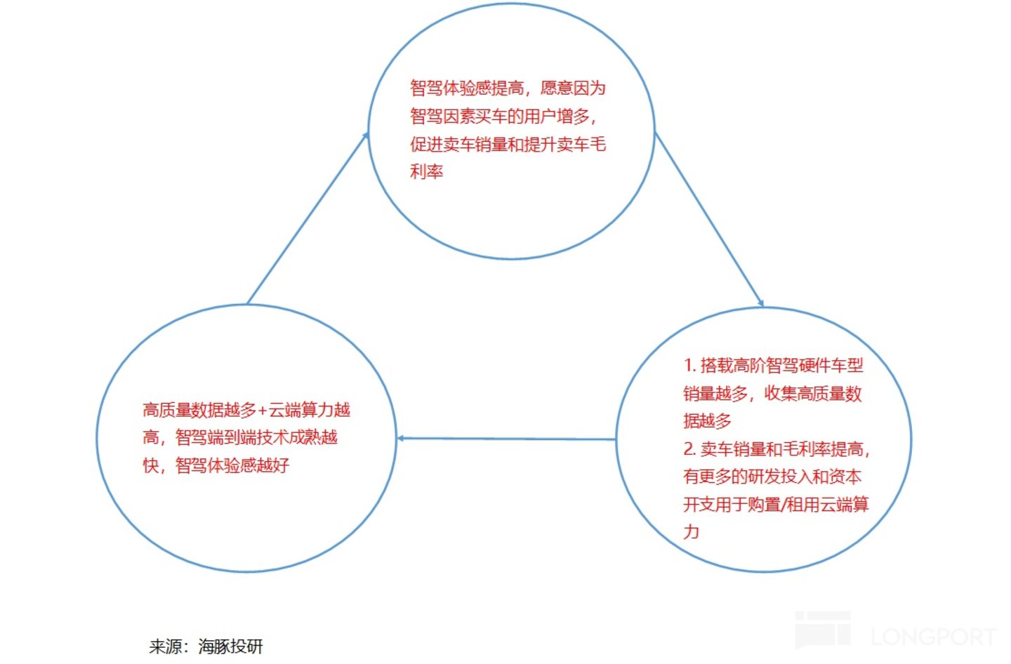 获取高质量数据的关键在于搭载高阶智驾硬件车型销量越多(只有搭载高阶智驾硬件车型的车辆才能完成高质量驾驶数据),而训练算力+智驾技术人才本质是资金竞赛(对应资本投入/研发投入增加),所以海豚君预计,在智驾技术尚未成熟,国内车企尚未能实现对智驾软件单独收费时,会形成以下闭环: