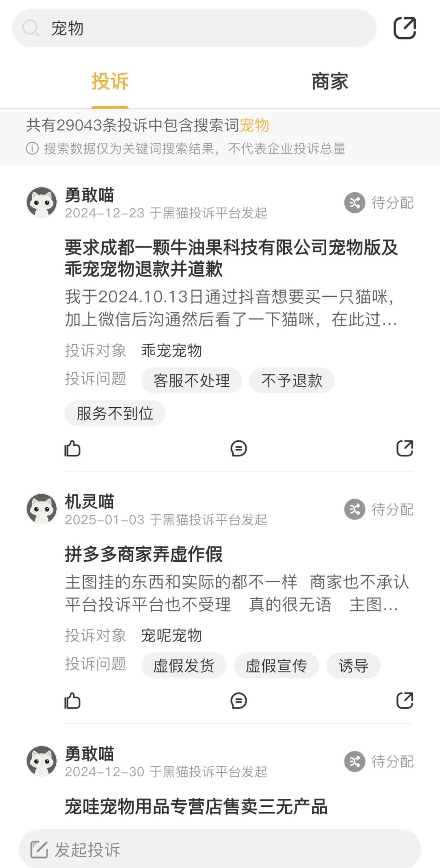 上述被害者小李上当的关键原因,就是轻信了卖家在抖音上的专业养宠人人设。小李并非个例,在已报道案例中,至今仍未追回钱财的比比皆是。仅黑猫投诉一个平台,搜索关键词#宠物#,近一年就有29043条投诉,翻阅投诉列表,也不乏网购被骗的例子。