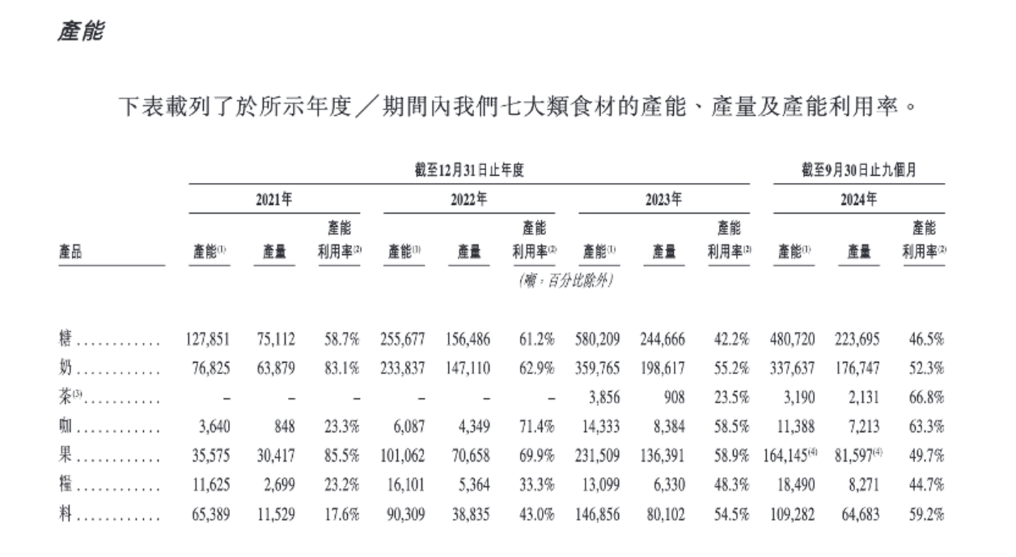 当下,海南基地尚未投产,蜜雪冰城已处于产能过剩状态。招股书显示,截至2024年9月30日,平均产能利用率仅为55%,其中糖、果、粮的产能利用率低于50%,最高的茶、咖也没有超过70%。
