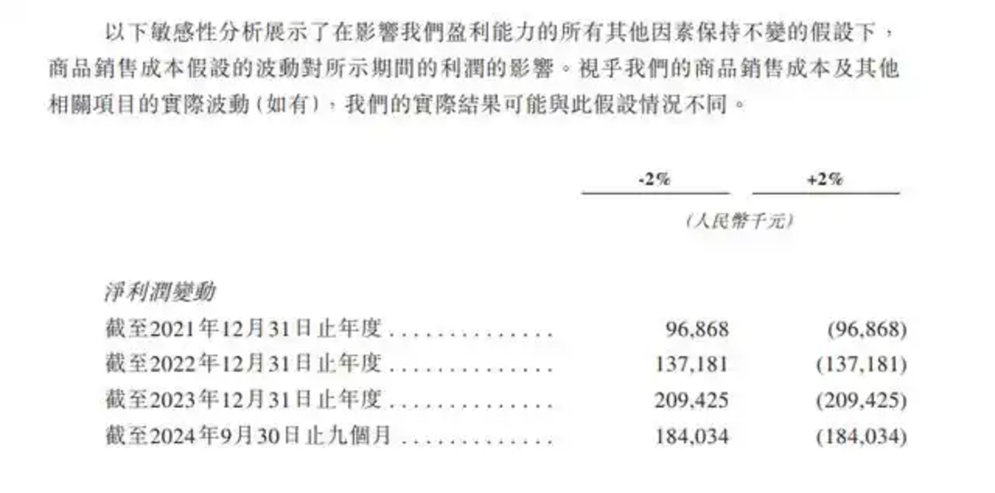 蜜雪冰城曾做过一项敏感性分析,在影响公司盈利能力的所有其他因素保持不变的假设下,销售成本变动2%,净利润将变动5%至7%。