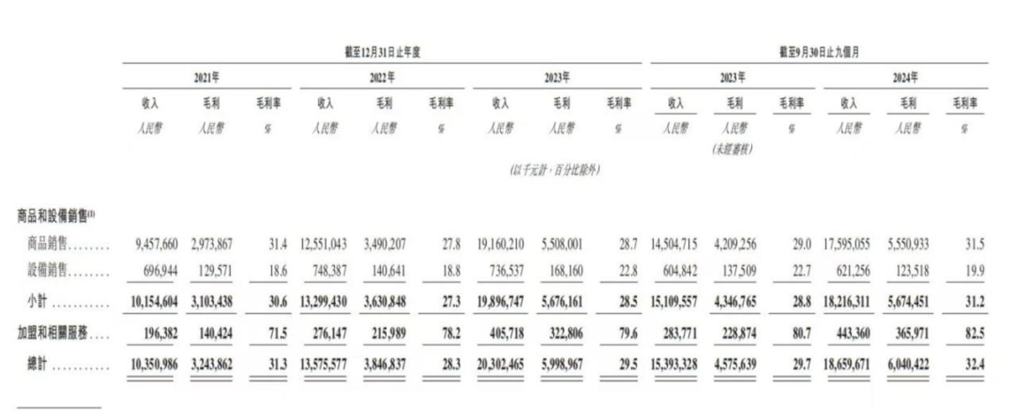 但加盟费在其中并非大头,2024年前9个月,加盟和相关服务收入为4.4亿元,仅占总营收的2.4%,另外有高达94.3%的收入来自向加盟商销售物料、约为176亿元(包含糖、奶、茶、咖、果、小料等材料),以及有3.3%的收入来自向加盟商销售设备、约为6.2亿元(包含冰箱、冰淇淋机、制冰机等设备)。