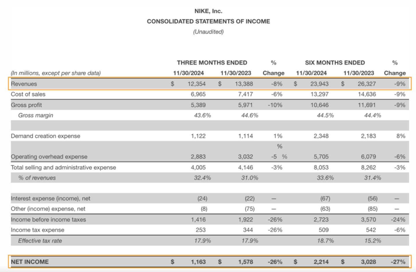 近日,耐克(NYSE:NKE)发布了2025财年第二季度的财报(截至2024年11月30日),数据显示,2025财年上半年,耐克营收达239.43亿美元,同比下滑9%,净利润为22.14亿美元,同比下滑27%。