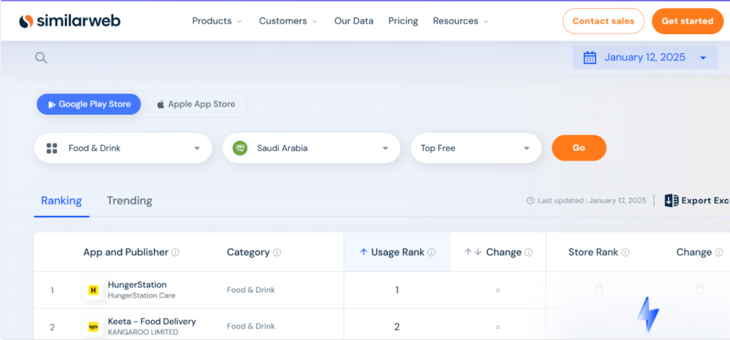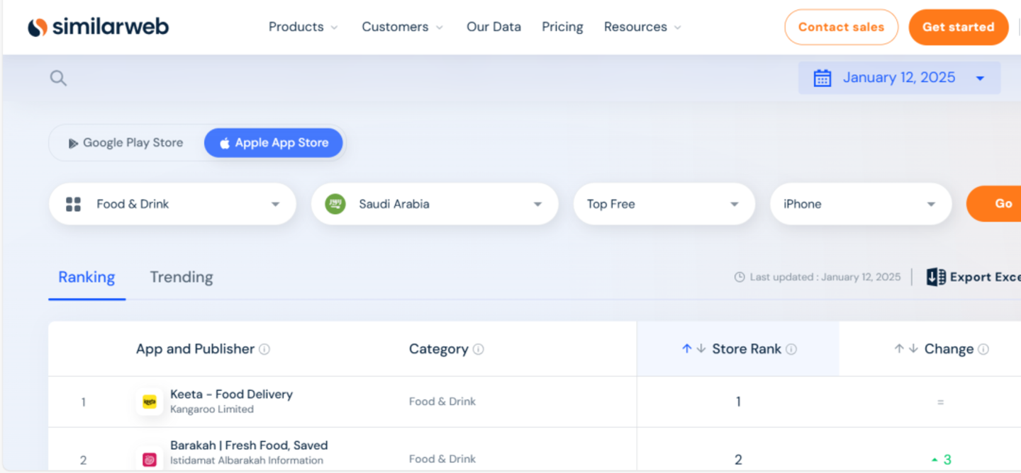 据悉,目前利雅得外卖市场日均订单量在50万左右,Keeta的日均单量约为10万单,市占率约为两成。截至1月12日, Keeta在沙特谷歌饮食类应用榜单上位居第二,仅次于成立于2012年的外卖巨头HungerStation;而在苹果应用榜单上则高居榜首。