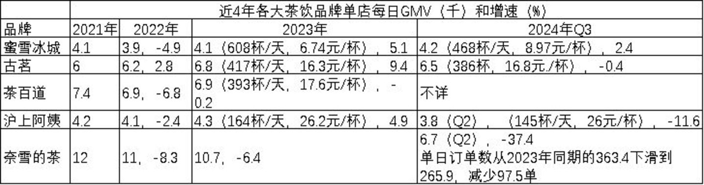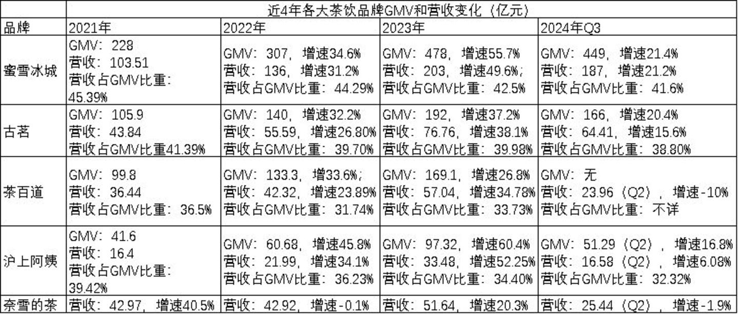 这五家茶饮品牌,其GMV和营收的增长直接跟门店数的扩张正相关,2022-2023年各家门店数增长最快,这两年各家的营收和GMV增速也是最大,没有低于23%的(奈雪的茶2022年数据除外)。2024年Q2和Q3各家的门店数增速下降到个位数,其营收和GMV增速也加速下降,沪上阿姨营收增幅下降到6.08%,茶百道的营收甚至负增长10%。蜜雪冰城因为门店增速依然有21.6%,其GMV和营收增速分别为21.4%和21.2%。