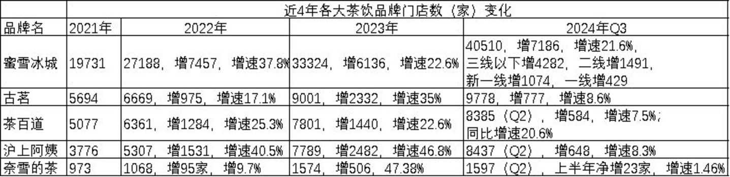 还在保持两位数增速(21.6%)开店的只有蜜雪冰城,2024年前三季度比2023年底增加了7186家店,是剩下四家茶饮品牌新增门店总和的3.5倍。