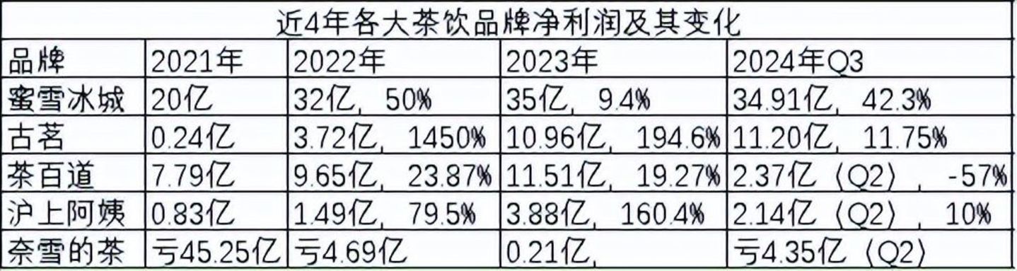 从蓝鲨消费制作的各大茶饮品牌利润对比表单可以看出,在中国茶饮市场红火的2021-2023年,各家茶饮品牌都享受到了利润的高速增长(奈雪的茶谜之操作除外),进入2024年Q2和Q3,古茗和沪上阿姨的利润增速都只有11.75%和10%,茶百道的利润甚至下滑57%,只有蜜雪冰城依然保持高达42.3%的利润增速,这是一家靠4万多家加盟店卖10元(以下)/杯的性价比茶饮取得的成就。