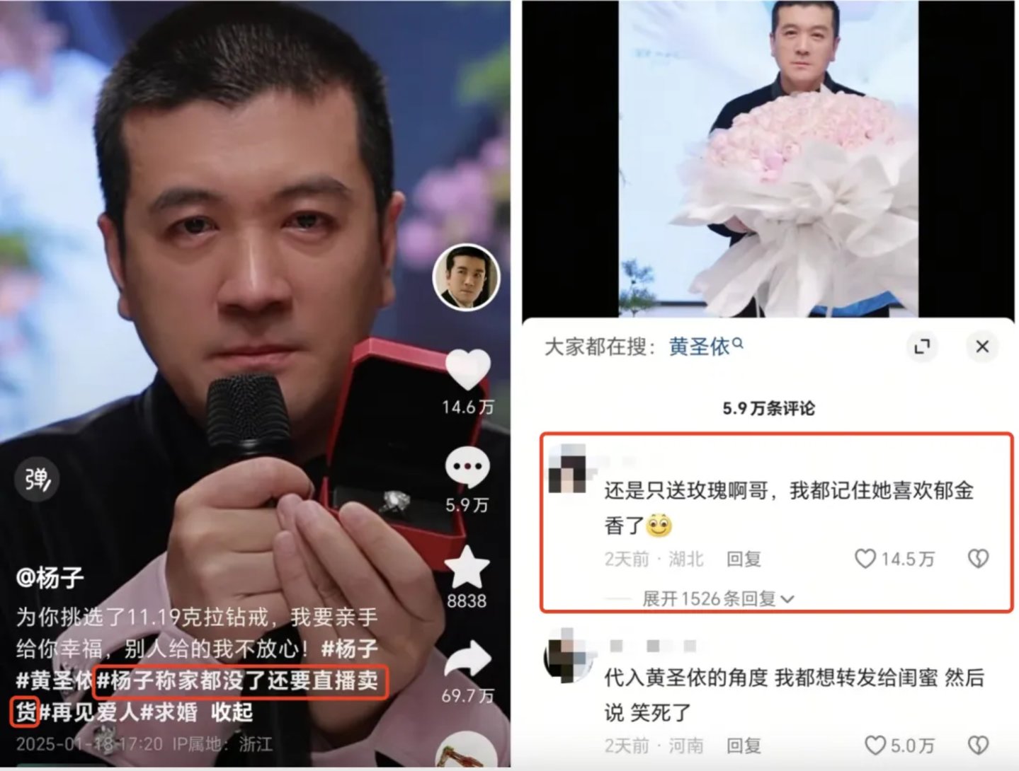 但尽管如此,杨子依然没有放弃这一话题热度,1.17日起,杨子官宣将在当日开启直播,连发三则视频为直播间预热,在最新一则视频中,他手捧粉色玫瑰以及11.9克拉钻戒,扬言要把黄圣依追回,说话过程中,双目含泪,数次哽咽。但有趣的是,这则视频下,杨子带上了#杨子称家都没了还要直播卖货 的话题。
