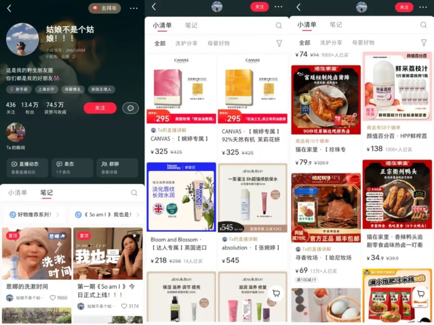 典型还有在第二季节目结束后开启直播带货的嘉宾张婉婷,2023 年起,她在小红书进行带货,当前,张婉婷小红书账号“姑娘不是个姑娘!!!”粉丝达到了13.4万。在其小红书账号中,张婉婷主要以育儿日常分享和精致生活穿搭内容为主,打造出了家庭主妇+精致妈妈的人设,通过其发布的笔记内容中可以看到不少好物种草贴,从张婉婷的账号小清单中,可以窥探出其带货品类之全面,既有美妆护肤产品,也有穿搭服饰,日用百货零食以及婴儿用品等。