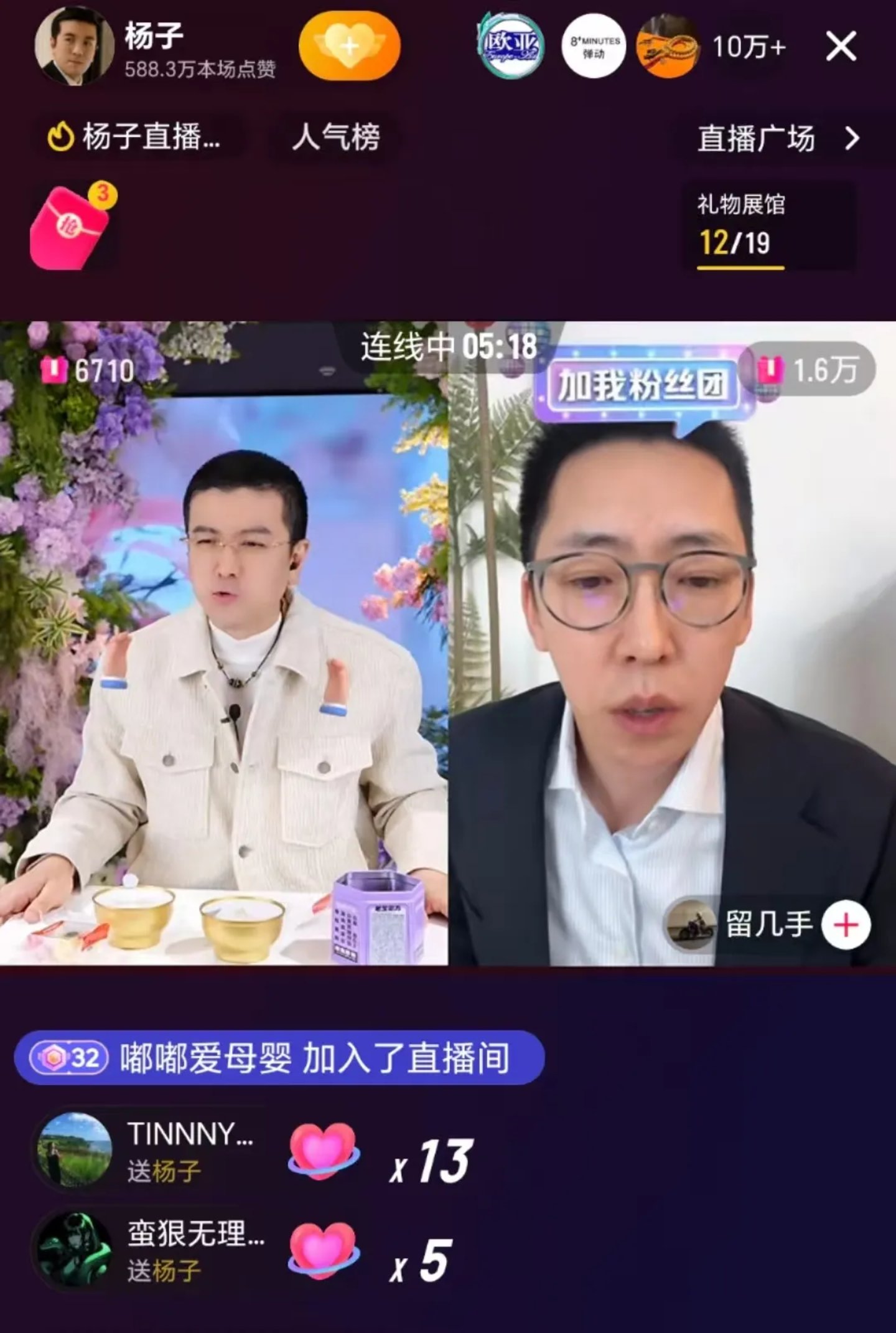 而在这档衍生节目开播前一天,恰巧碰上了杨子“回归家庭”的日子——1月18日。当晚,杨子在抖音开直播,刚一开播在场人数就突破了10W+,在杨子带头下,当晚留几手、麦琳、葛夕也在抖音同步开播,并创造了杨子、留几手、麦琳同屏PK的名场面。