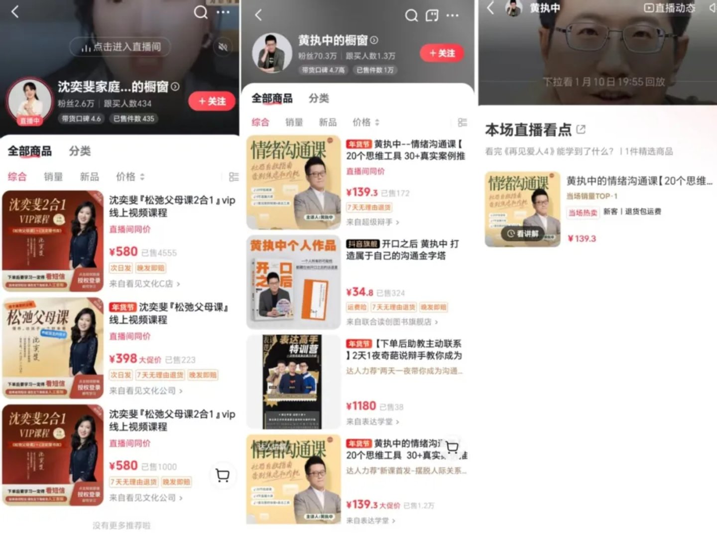 观察室嘉宾导师黄执中也借助《再见爱人》的流量持续为其个人IP商业化变现背书。1月10日黄执中曾在小红书开播,以《再见爱人4》为噱头,推荐其售价为139.3元的情绪沟通课。当前,黄执中在抖音坐拥70.3万粉丝,小红书粉丝达到24.4万。此外,他还是百万畅销书《好好说话》的作者,不仅在线上设立了多门售价千元以上的视频课程,更是在线下展开了“2天1夜的表达高手特训营。