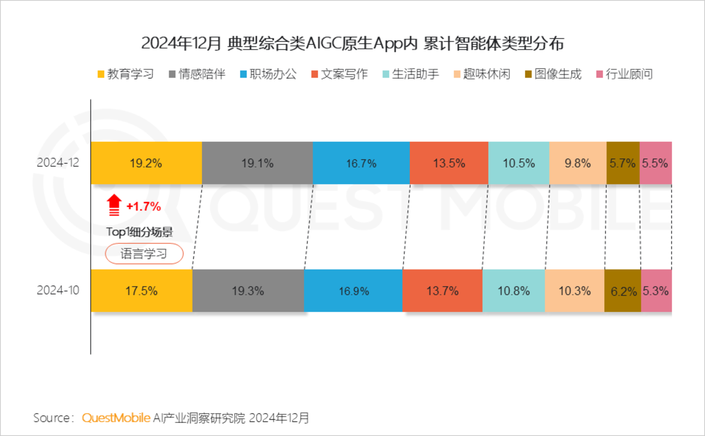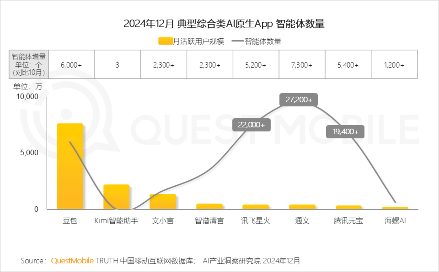当然,最重要的“智能体”在2024年得到了长足的发展,从上游的大模型、基础设施,中游的智能体开发生态(平台及创作者),下游的AI落地应用,相对独立的产业链也已经形成,截止到2024年12月,头部综合类AI原生APP中的智能体数量已经超过102000个,相比10月份增长了41.7%!