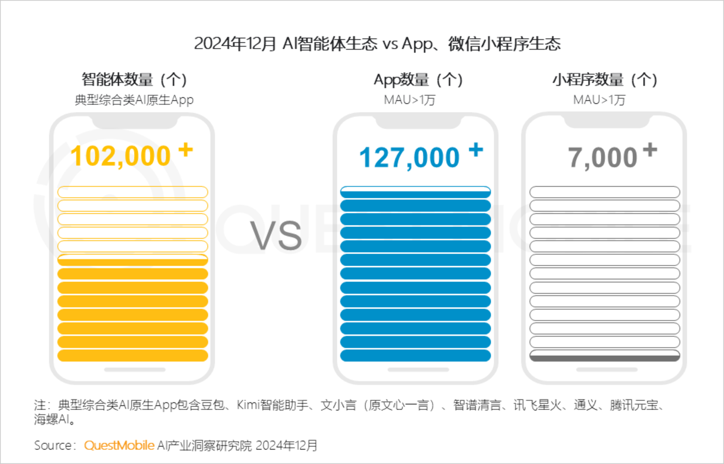 这也让智能体数量一举超过了小程序数量(MAU大于1万,7000+),仅次于APP数量(MAU大于1万,127000+),而按照当前的发展速度,2025年,智能体的数量将迎来惊人爆发……