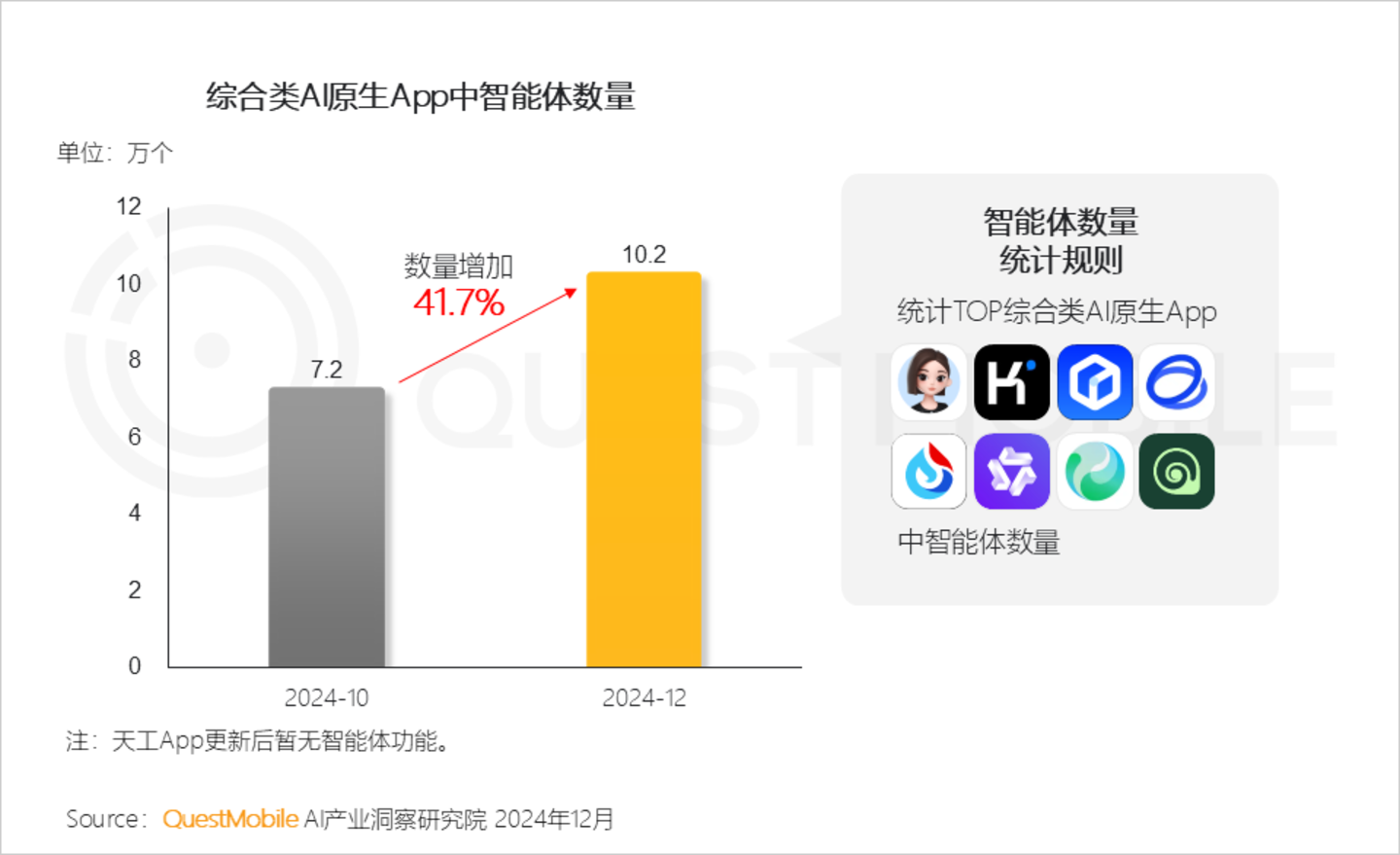 4、智能体的“低门槛”生产特性使其如“雨后春笋般”快速落地;截至2024年12月,头部综合类原生App中已集合超10万体量智能体,较10月增加41.7%