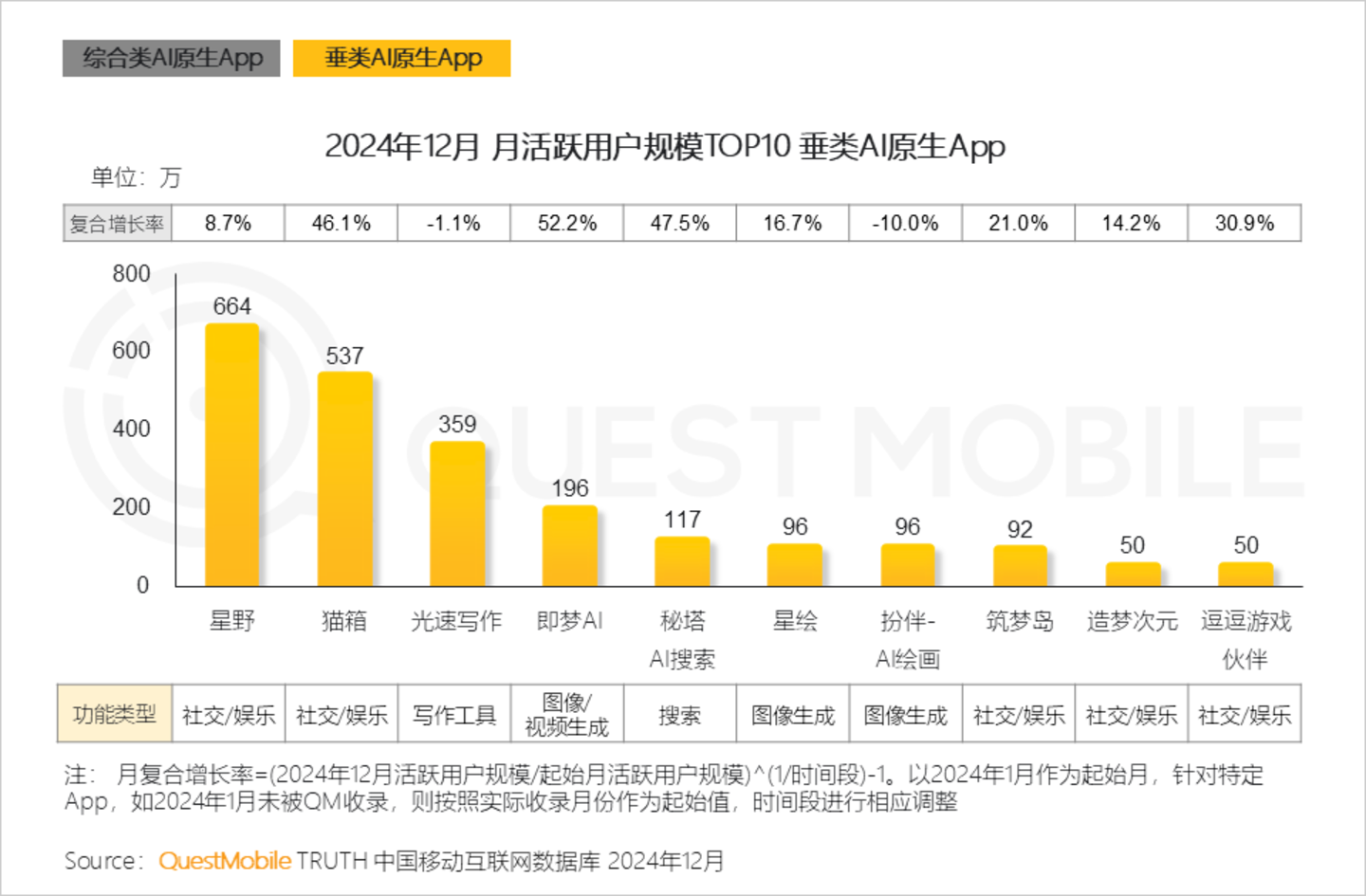 垂类AI原生APP赛道目前还相对“宽敞”,千万级应用尚未出现,社交类的“星野”、“猫箱”,写作类的“光速写作”,图像视频生成类的“即梦AI”,搜索类的“秘塔AI搜索”,月活跃用户分别为664万、537万、359万、196万、117万,位居前五位,从用户画像和使用粘性上看,还有很多发展空间。