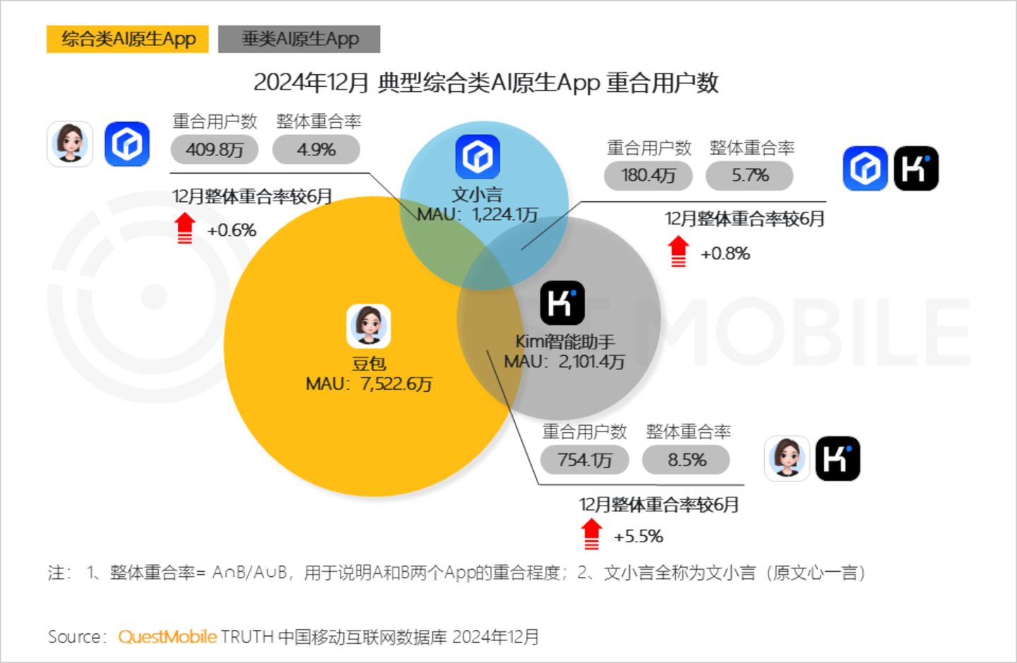 同时,虽然增量用户还有很多,且83.5%的用户只使用1个综合类AI原生APP,但是,“三强”之间的战争已经爆发,尤其是豆包的持续扩张,对文小言、Kimi带来了不小的挤压,数据显示,12月份,豆包与Kimi、文小言的重合用户已经分别达到754.1万、409.8万,相比6月份重合率分别上升了5.5%、0.6%,可以预见的是,2025年这场碰撞将会更加激烈。