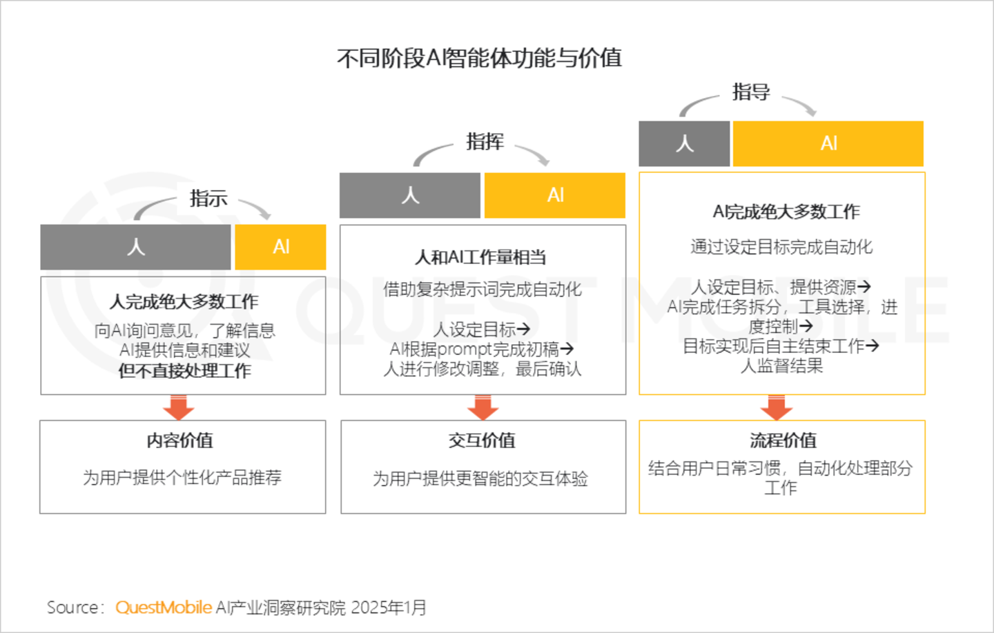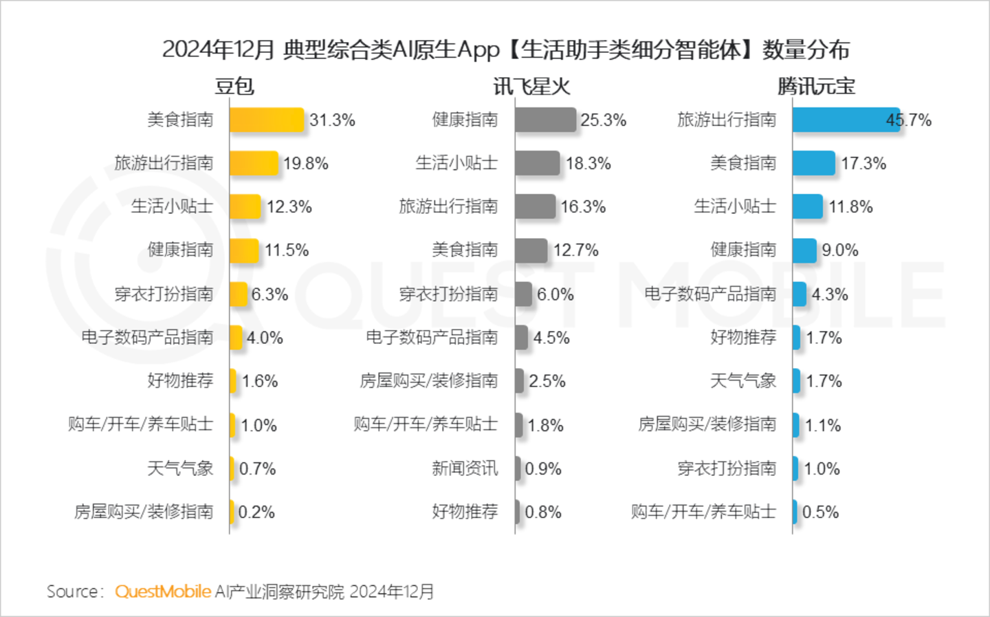 QuestMobile数据显示,豆包-美食指南类智能体占比31.3%,讯飞星火-健康指南类占比25.3%,腾讯元宝-旅游出行指南占比45.7%。