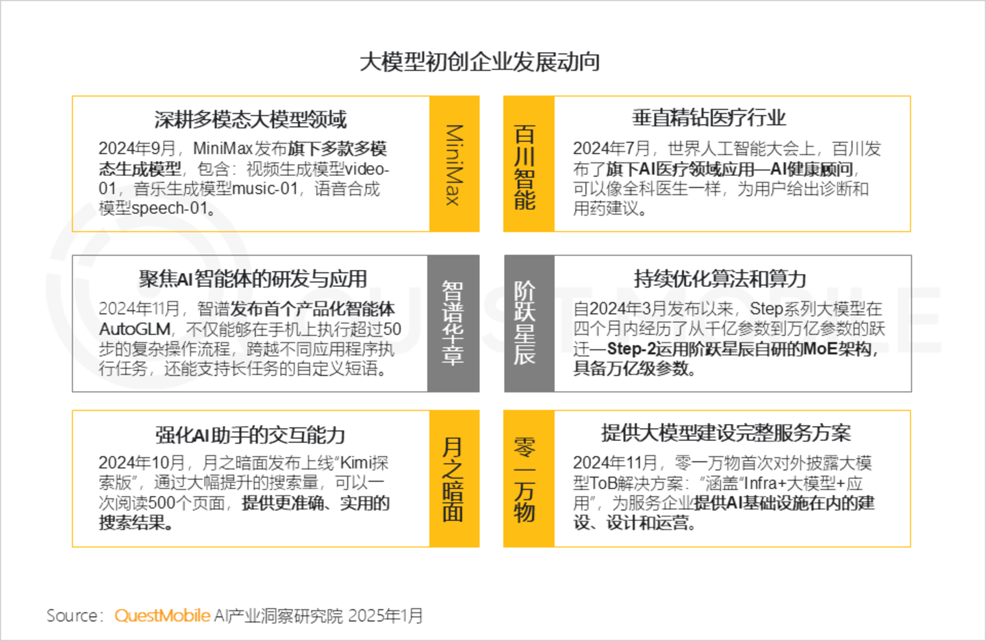 5、大模型初创“六小虎”代表则踏上了不同的技术路线及行业赛道,各有聚焦和深耕