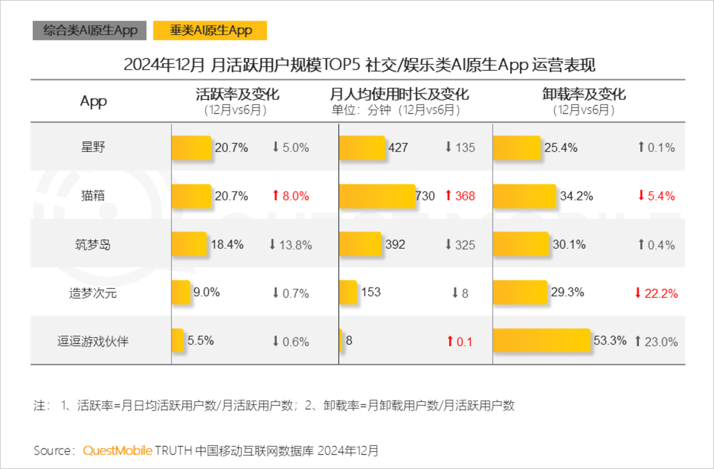 具体来看,AI原生APP在赛道划分上已经逐渐形成了基本的用户认可度,例如综合类AI原生APP方面,由于主打解决用户大部分场景需求的目标,容易出现口碑上的两极分化,导致活跃率、卸载率的表现不佳,不过,过去半年多,头部玩家已经持续在解决这方面的问题,豆包、Kimi、文小言“三强格局”已经形成,月活跃用户规模分别为7523万、2101万、1224万,2024年全年的复合增长率分别增长21.2%、69.4%、4.7%。