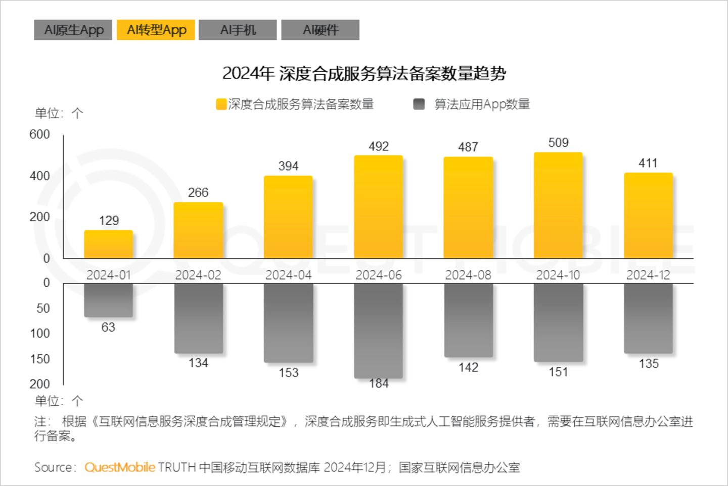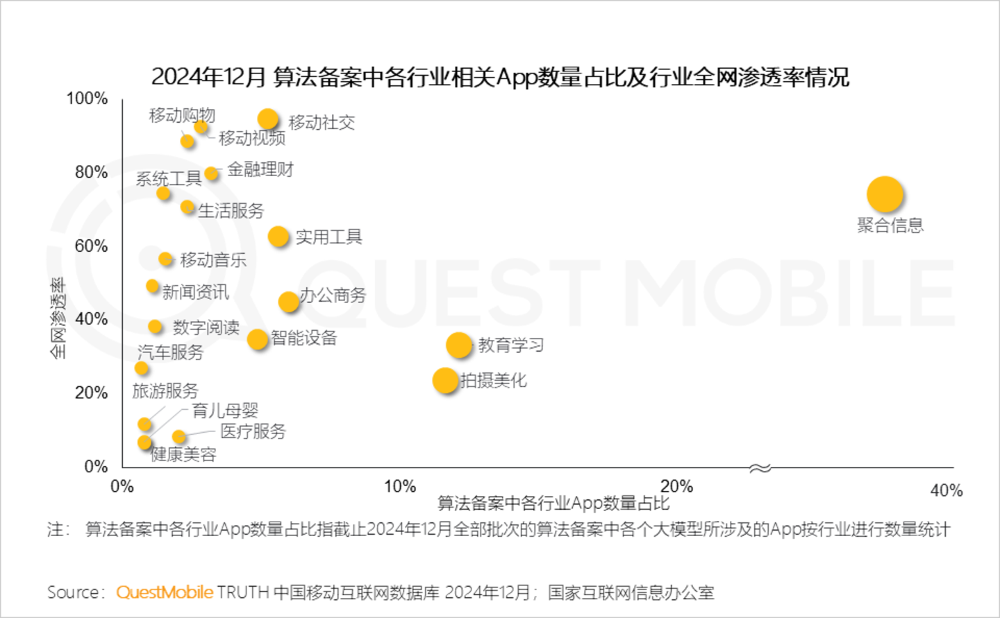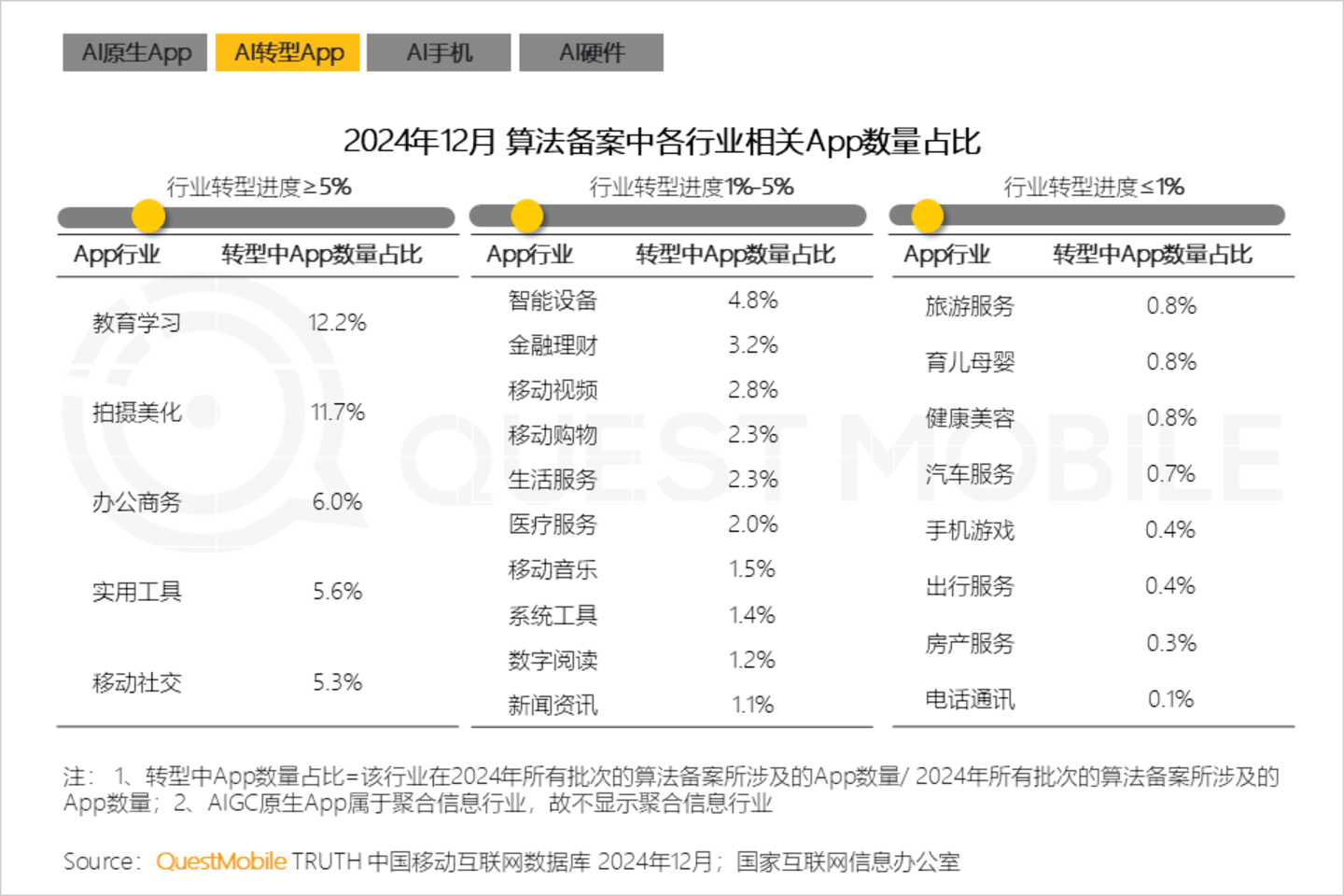 例如,2024年,用户规模在亿级以上的APP中,已经有70%进行了“AI转型”,全行业看,共有962个传统APP备案了“深度合成算法”,其中,教育学习、拍摄美化、办公商务、实用工具、移动社交等行业位居前五,占比分别为12.2%、11.7%、6%、5.6%、5.3%。