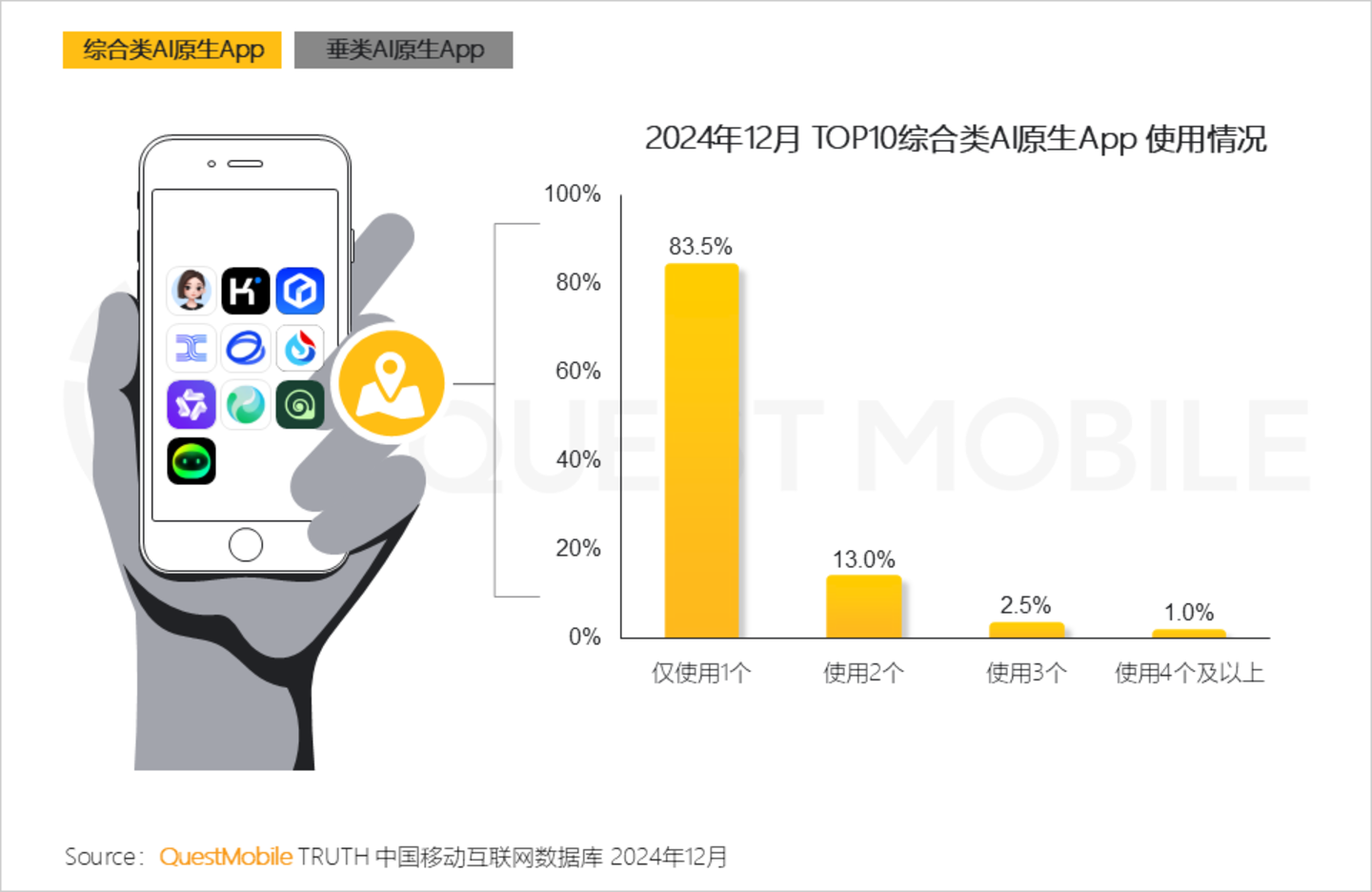QuestMobile数据显示,截止到2024年12月,AI原生APP月度活跃用户已经突破1.2亿,同比增长232%,同时,用户粘性也持续增长,整体月人均使用时长达133.0分钟,月人均使用次数也达到49.6次。