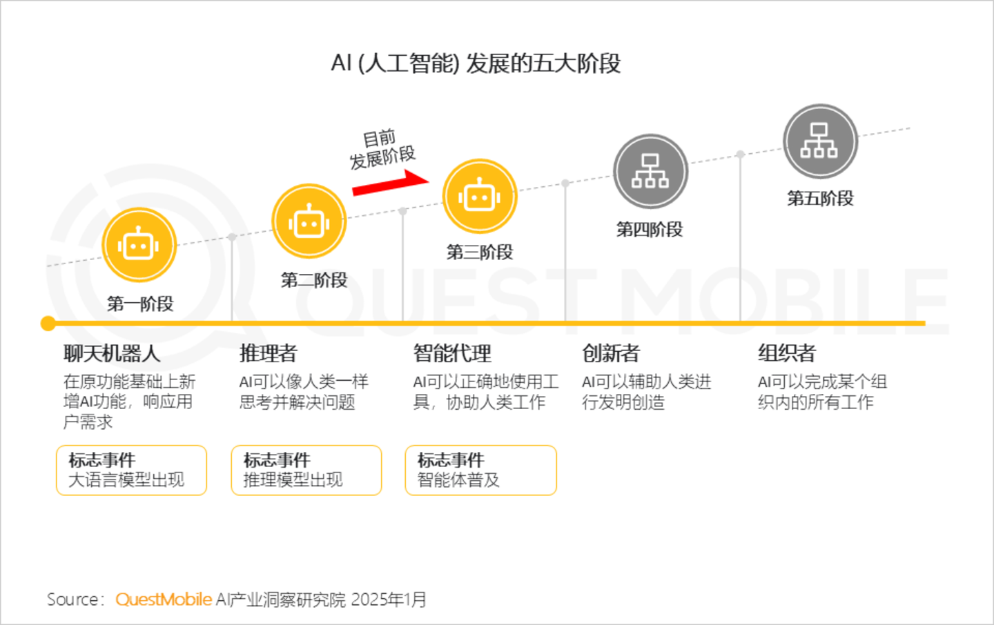 2、当下,AI的发展正处于“二进三”阶段,推理模型的演进以及AI智能体的普及是发展关键要素