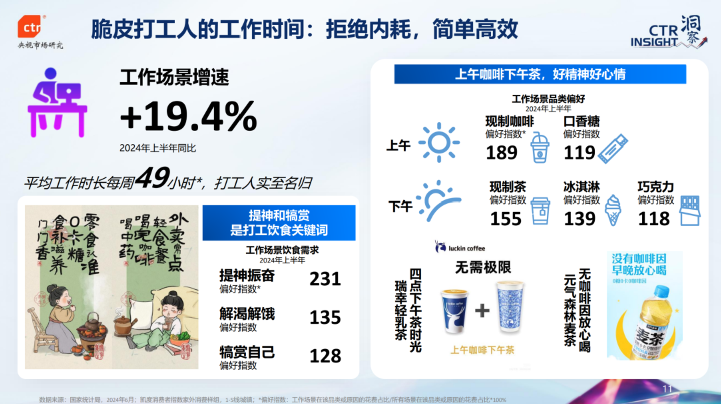 例如工作场景消费的增长,带动了“脆皮打工人”属性生成,上午咖啡下午茶成为潮流;而下班后,几乎同一群人又摇身一变,自我犒赏的需求又让运动充能的需求浮现。