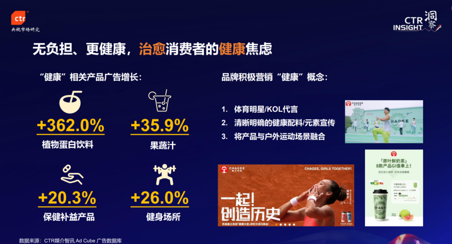 广告市场也呼应了这个趋势,大的传播当量背后,是品牌对消费心智的深刻洞察。数据显示,以今年前7个月为代表的,被称为“近水化饮料”的如植物蛋白饮料、果蔬汁品类广告投放增幅惊人,分别达到362%和35.9%。而保健补益类产品和健身场所相关推广的曝光增长均超过20%。