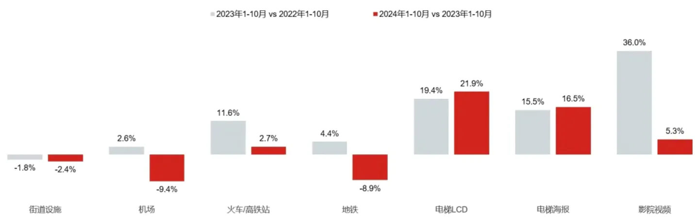2024年1-10月各户外广告渠道花费同比变化 数据来源:CTR媒介智讯 Ad Cube 广告数据库