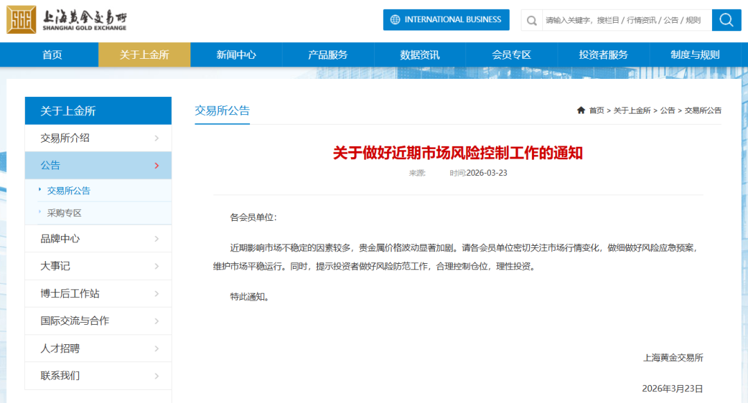 3月23日,上海黄金交易所发布《关于做好近期市场风险控制工作的通知》称,近期影响市场不稳定的因素较多,贵金属价格波动显著加剧。请各会员单位密切关注市场行情变化,做细做好风险应急预案,维护市场平稳运行。同时,提示投资者做好风险防范工作,合理控制仓位,理性投资。