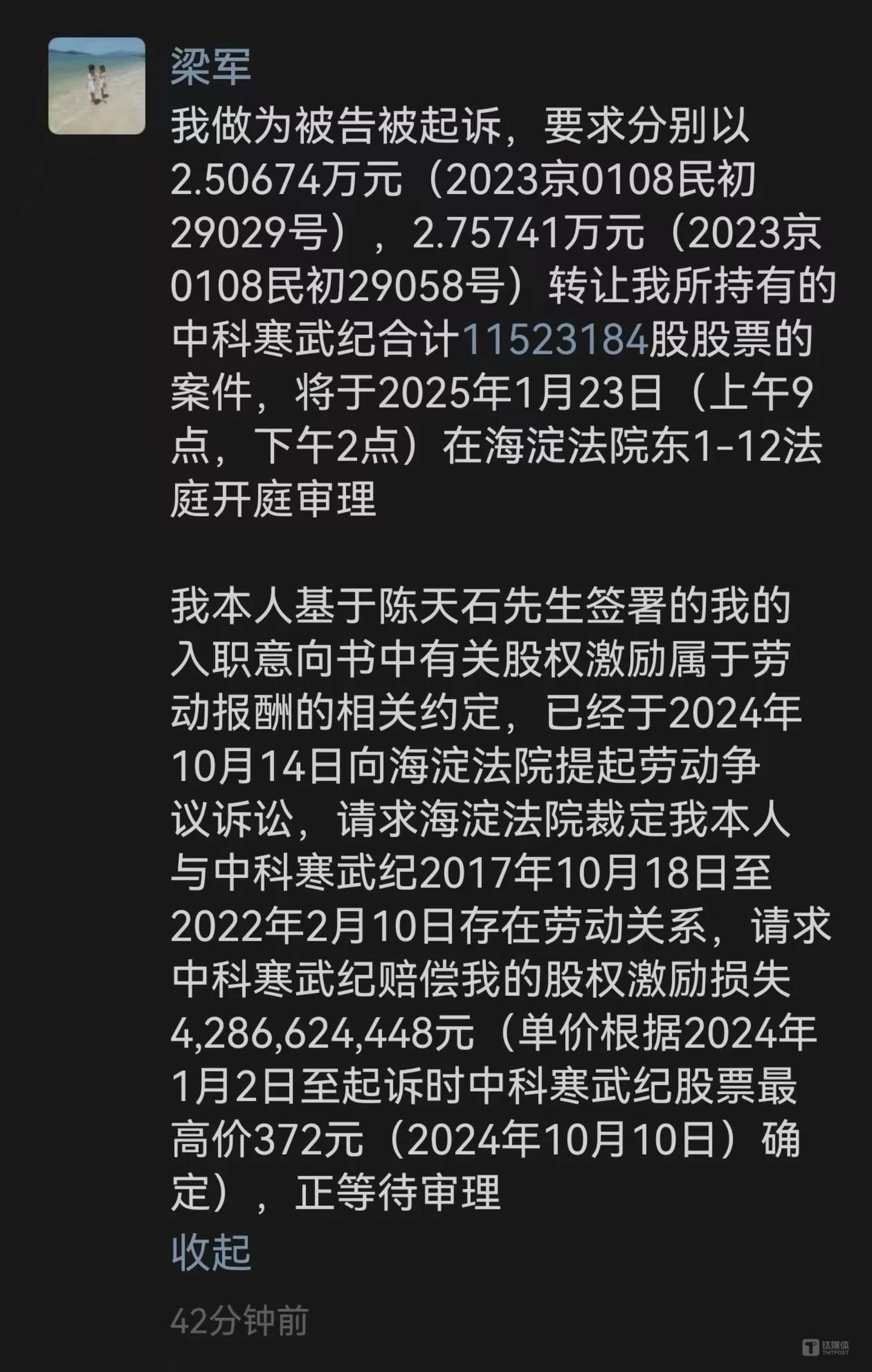 “我本人基于陈天石先生(寒武纪创始人、CEO)签署的我的入职意向书中有关股权激励属于劳动报酬的相关约定,已经于2024年10月14日向海淀法院提起劳动争议诉讼,请求海淀法院裁定我本人与中科寒武纪2017年10月18日至2022年2月10日存在劳动关系,请求中科寒武纪赔偿我的股权激励损失4,286,624,448元(单价根据2024年1月2日至起诉时中科寒武纪股票最高价372元(2024年10月10日)确定),正等待审理。”梁军在朋友圈称。