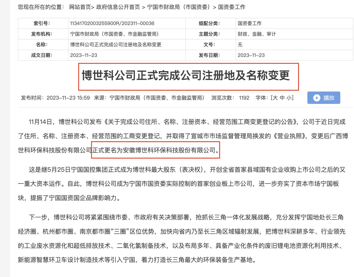 宁国国控控股博世科的意义之一,一度是“开创全省首家县域国有企业收购上市公司之后又一资本动作,成为宁国市国资委实际控制的首家创业板上市公司”。