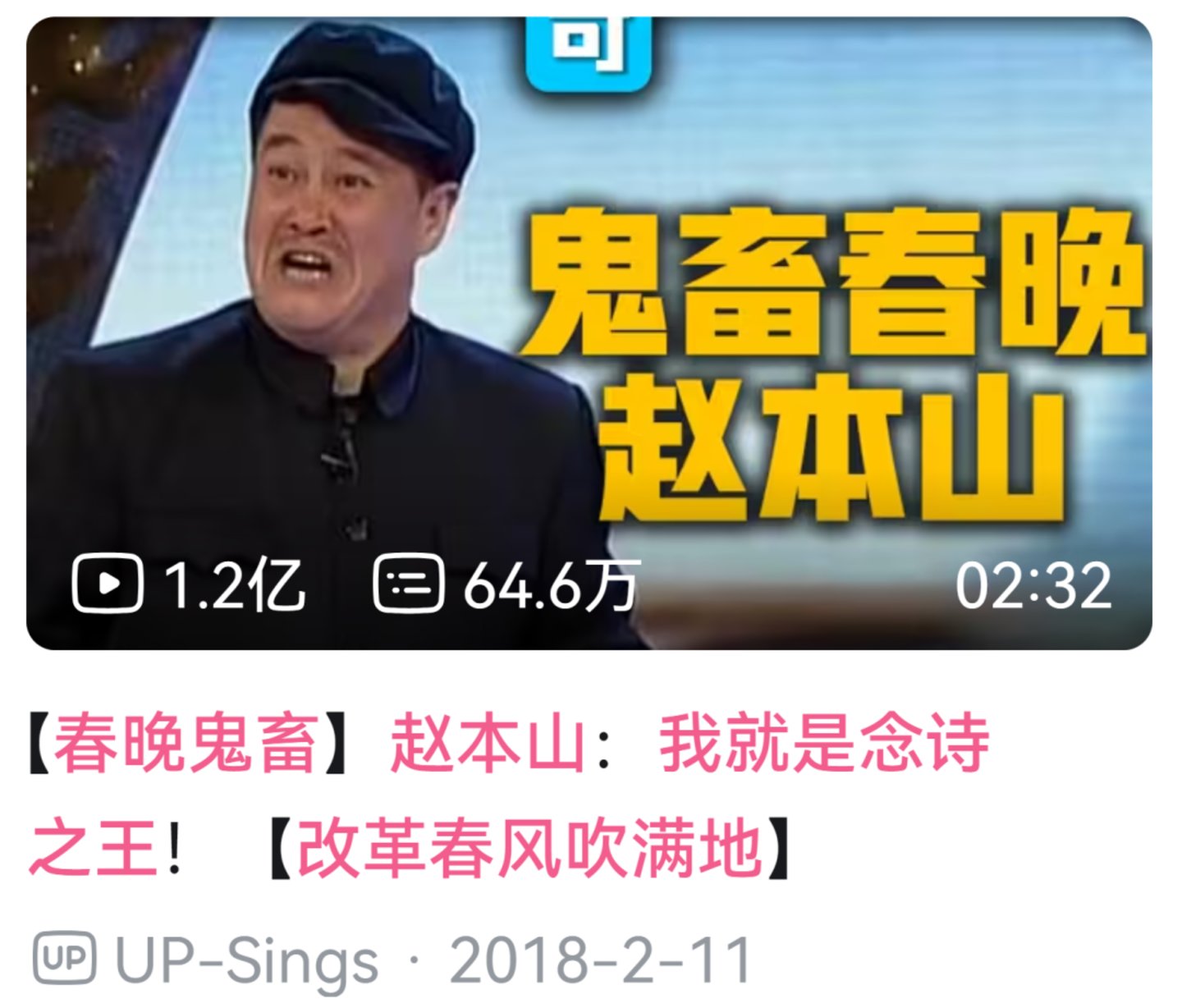 在B站上搜索关键词“春晚”,内容五花八门、题材多样。在“春晚混剪”类目中,@UP-Sings 2018年发布的《【春晚鬼畜】赵本山:我就是念诗之王!【改革春风吹满地】》如今已收获1.2亿播放量,被收录至“入站必刷98大视频”;而“经典节目回顾”上,也有@MarcusPierce 发布的《1990年春晚小品<主角与配角>》斩获1289.7万播放量,1.7万评论里几乎每三天就有人掀起一波“回忆杀”。