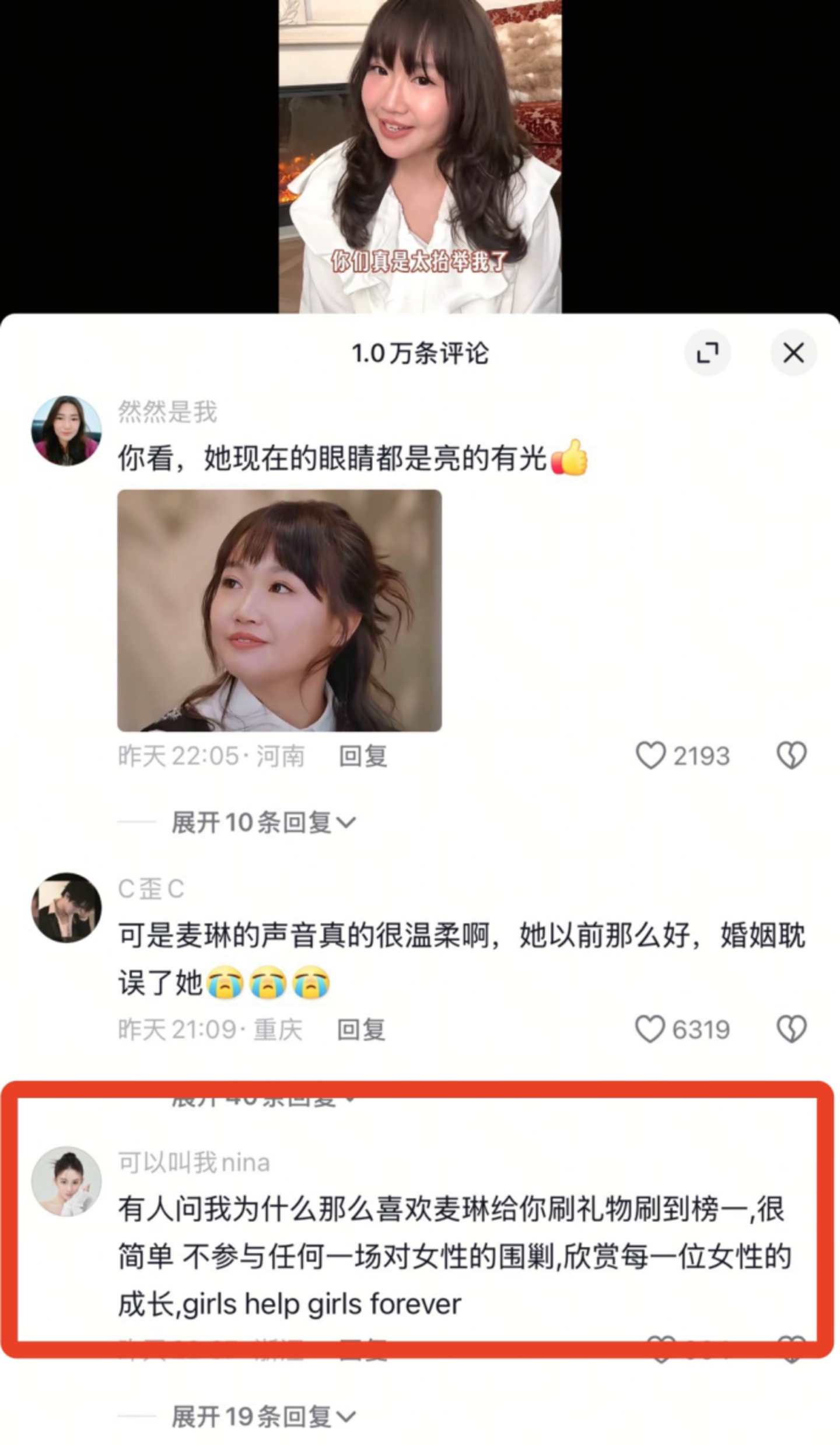 蝉妈妈数据表示,当晚,麦琳首场直播下来,场均观看破千万,涨粉至24万。评论区大部分都在夸她瘦、可爱,真诚温柔,还有宝妈网红作为“榜一大姐”,一直给麦琳刷礼物。