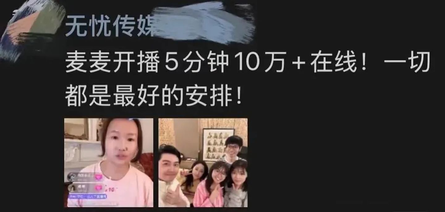 抖音直播中途,无忧传媒相关人员也在朋友圈发布战报表示:“麦麦开播5分钟10万+在线,一切都是最好的安排”,并配上和麦琳李行亮夫妇的合影。