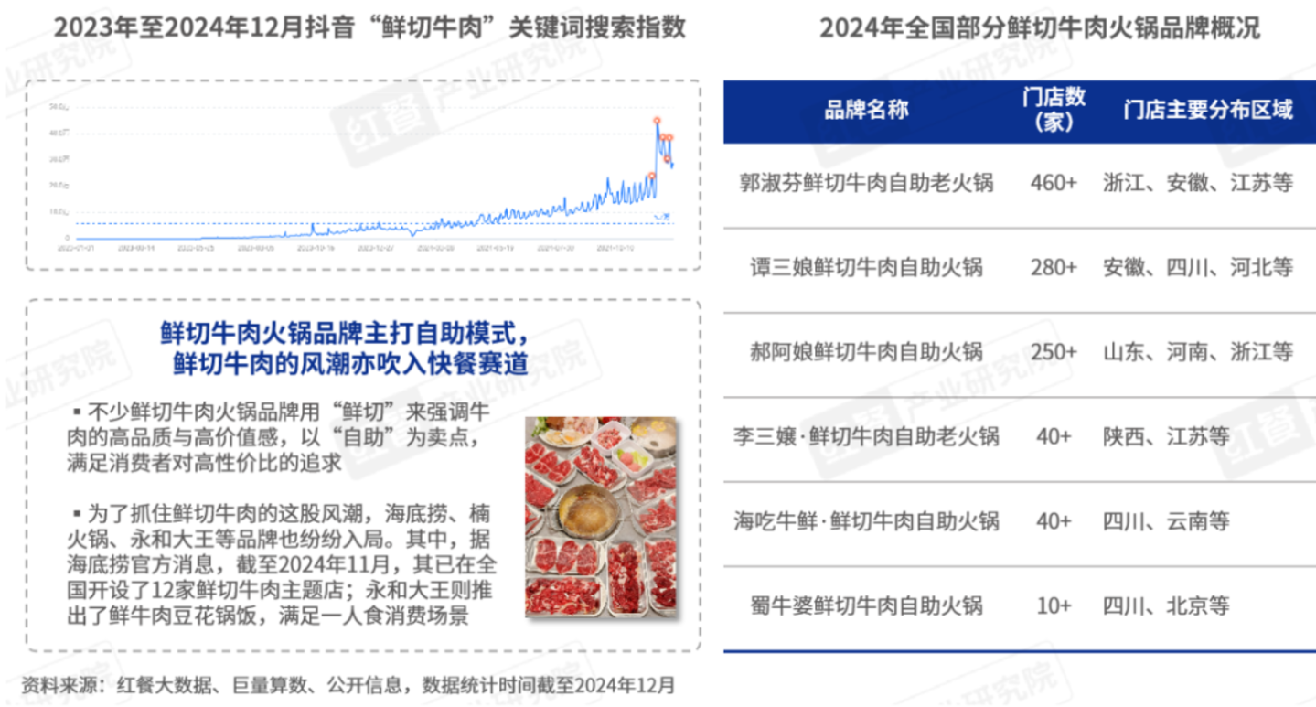 与此同时,随着牛肉这一“明星食材”价格的下探,围绕牛肉大单品展开的餐饮生意做得如火如荼,鲜切牛肉火锅、生烫牛肉粉、鲜烧牛肉等赛道发展势头较强。