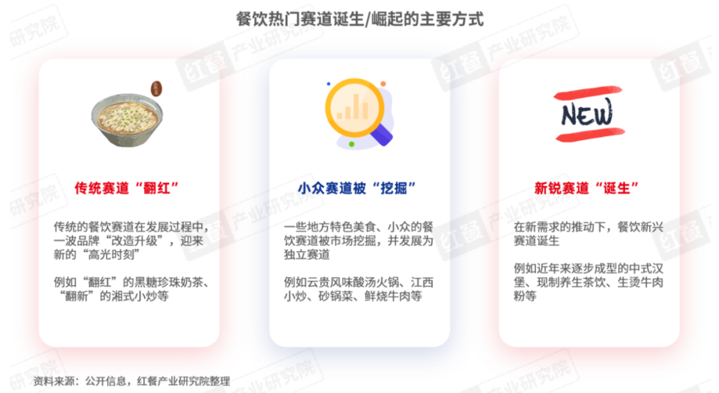 红餐产业研究院在梳理一些热门餐饮赛道的成长过程时发现,一些餐饮赛道能够成长为热门赛道,其诞生或崛起的方式主要有三种:传统赛道“翻红”;小众赛道被“挖掘”;新锐赛道“诞生”。