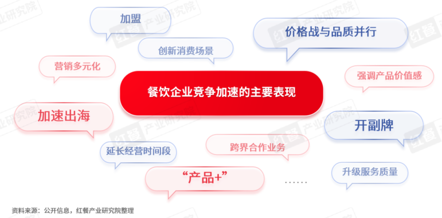 在新的局面下,餐饮企业的竞争更加多元,有的企业通过加盟、出海、开副牌等方式加速“跑马圈地”;有的企业通过“卷价格”、“产品+”的模式、延长经营时间段、创意性的营销策略等方式抢占消费市场;还有的企业通过强调产品价值感、升级服务质量、创新消费场景等方式进一步夯实企业竞争力。