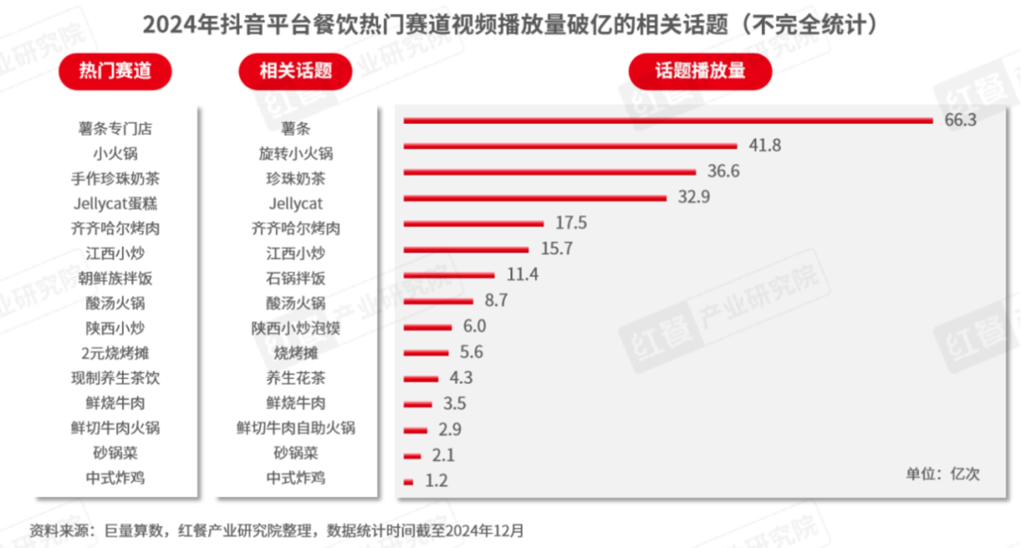 据红餐产业研究院不完全统计,从每条餐饮热门赛道中选取一个热度最高的相关话题来计算,2024年抖音平台相关话题视频播放量破亿的餐饮热门赛道超15个。其中“薯条”“旋转小火锅”“齐齐哈尔烤肉”“江西小炒”“石锅拌饭”等话题的视频播放量超10亿次,“酸汤火锅”“陕西小炒泡馍”“养生花茶”“鲜切牛肉自助火锅”“砂锅菜”等话题的热度也较高。