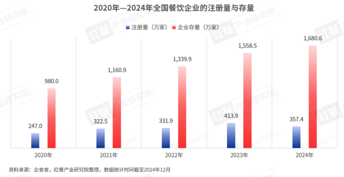 当前,餐饮行业的入局者体量仍显“庞大”。据企查查,截至2024年12月,全国餐饮企业存量超过1,600万家,同比增长了7.8%。