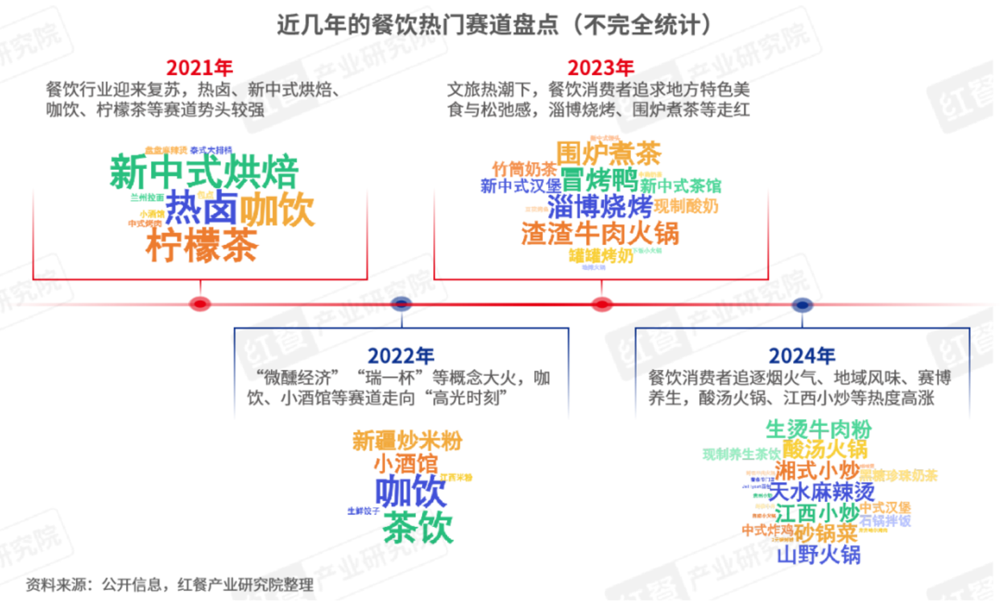 其中既有围炉煮茶、淄博烧烤、天水麻辣烫等现象级热门赛道,又有咖饮、新中式餐饮等长红赛道。据红餐产业研究院不完全统计,2024年的餐饮热门赛道超23条,如薯条专门店、小火锅、手作珍珠奶茶、齐齐哈尔烤肉、江西小炒、酸汤火锅、现制养生茶饮、鲜切牛肉火锅、砂锅菜、中式汉堡、生烫牛肉粉等。