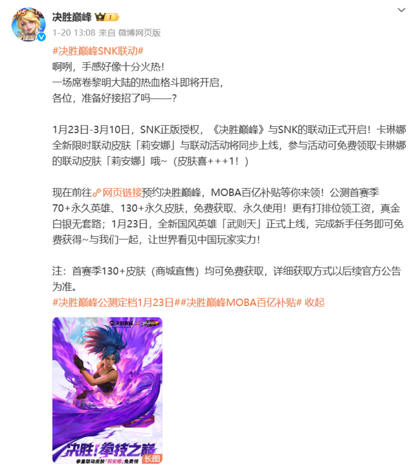 1月23日-3月10日《决胜巅峰》与SNK的联动开启。卡琳娜全新限时联动皮肤「莉安娜」与联动活动将同步上线,参与活动可免费领取联动皮肤。