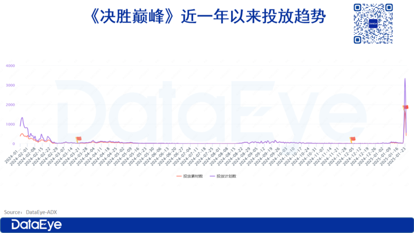 DataEye-ADX达人营销数据显示,《决胜巅峰》早在2023年12月末开始推动效果型达人视频内容的投放,而且持续到去年6月初。同时,达人直播也同步开启,持续到2024年11月,不过达人直播在2024年1月后呈现波动状态,推测也与《王者荣耀》可以同期在抖音开启直播有一定关系。