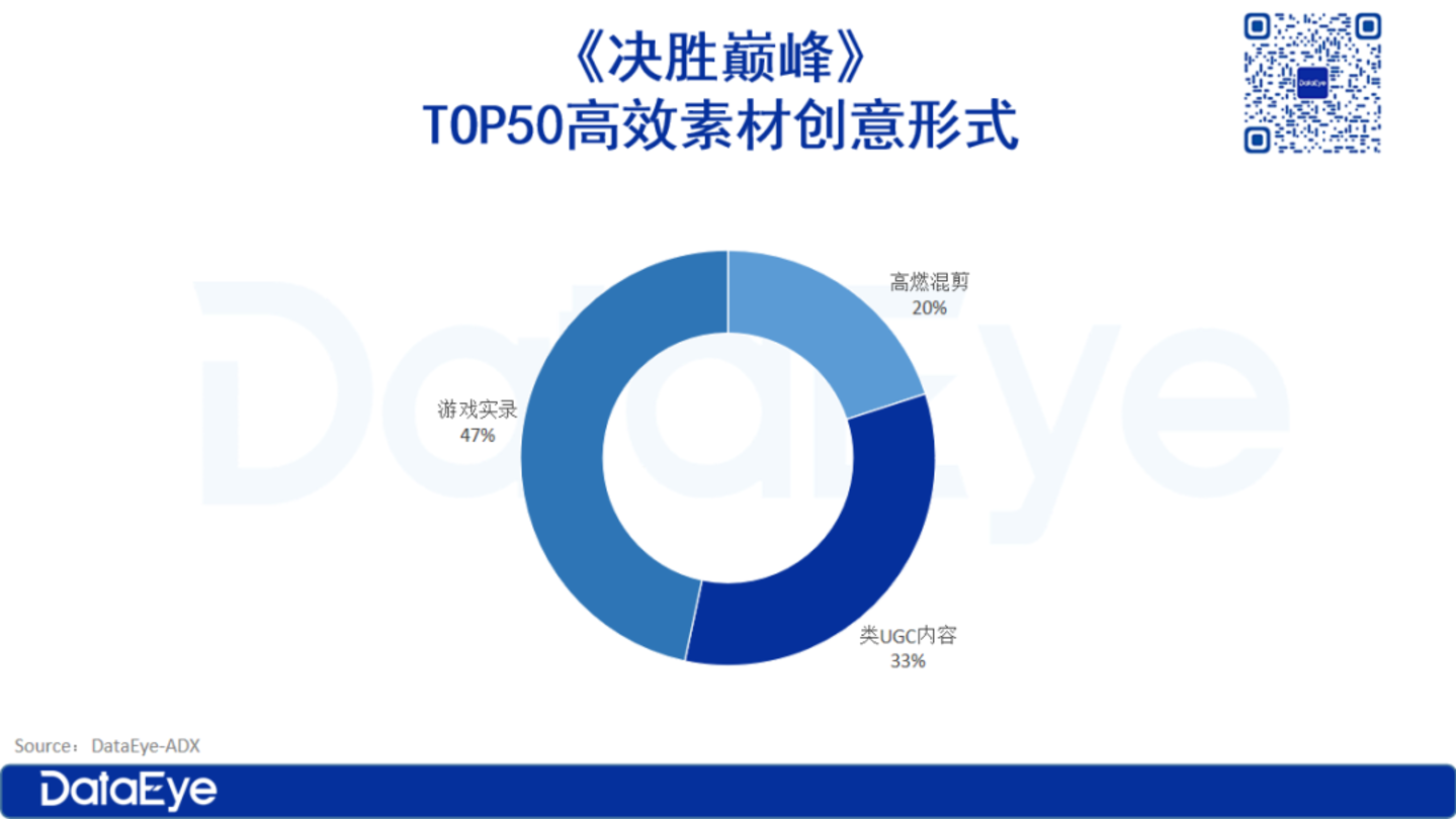 而大陆市场的创意,则有较大差异。DataEye研究院整理了近期最多计划使用的TOP50视频素材,占比最高的是游戏实录达47%,其次是类UGC内容,占比33%,高燃混剪占比20%。
