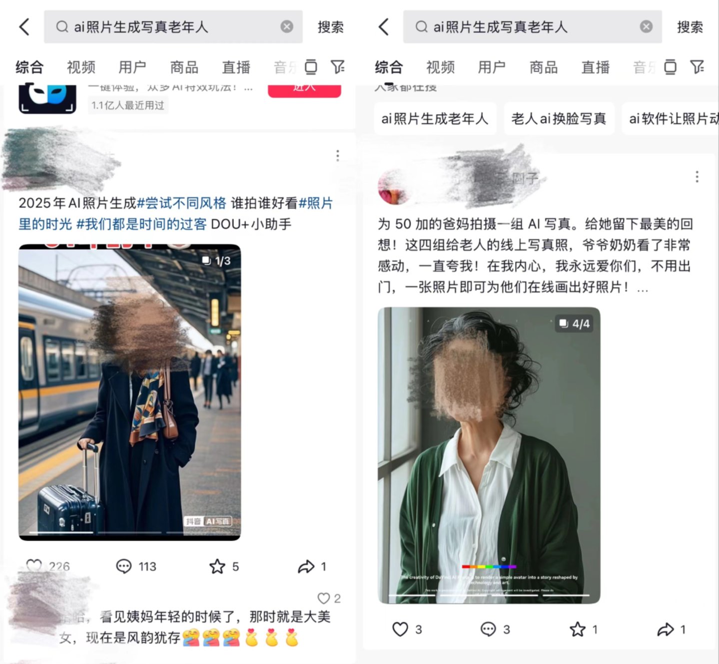 图:社交平台与“AI老年写真”相关的分享内容 来源:抖音 《听筒Tech》截图