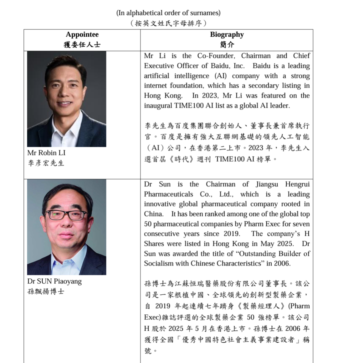 3月24日,香港特区政府宣布委任4名特首顾问团新成员,包括百度集团联合创始人李彦宏,江苏恒瑞医药股份有限公司董事长孙飘扬,赛昉半导体科技有限公司创始人兼行政总裁徐滔,壁仞科技创始人、董事长兼首席执行官张文。