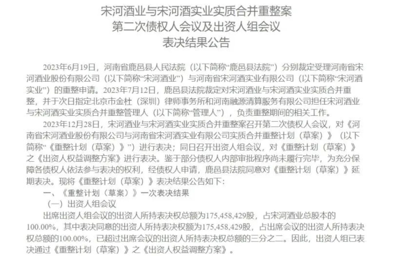 近日,宋河酒业与宋河酒实业实质合并重整管理人发布公告显示,《河南省宋河酒业股份有限公司与河南省宋河酒实业有限公司实质合并重整计划(草案)》(以下简称《重整计划(草案)》)已获得第二次债权人会议表决通过。
