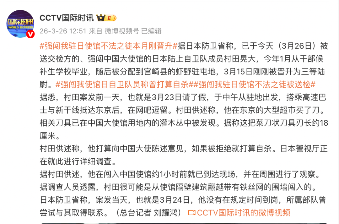 据日本防卫省称,已于今天(3月26日)被送交检方的、强闯中国大使馆的日本陆上自卫队成员村田晃大,今年1月从干部候补生学校毕业,随后被分配到宫崎县的虾野驻屯地,3月15日刚刚被晋升为三等陆尉。