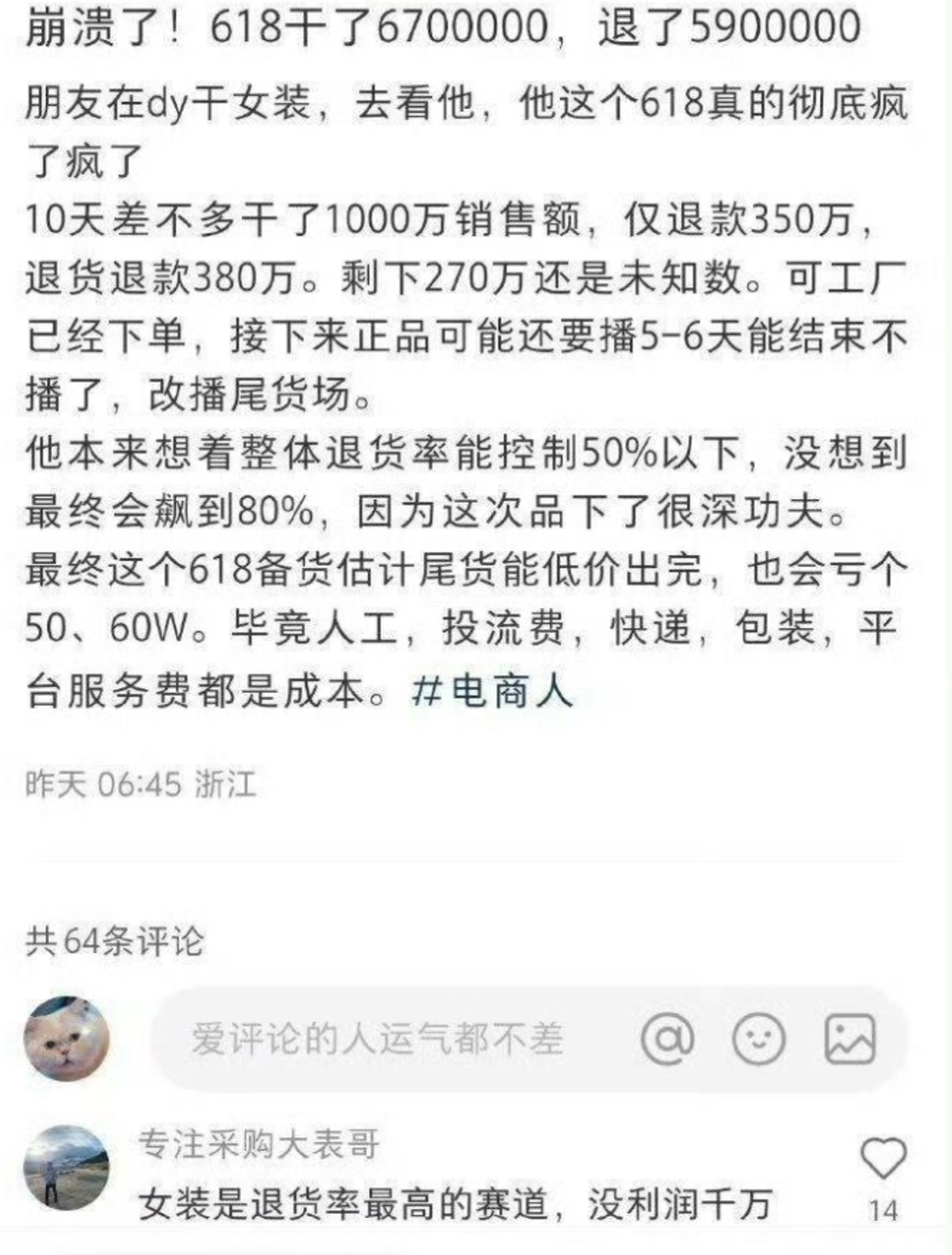 “这一年真是够呛。定制鲨鱼裤因为面料问题,退货率和品退率高得吓人。推广费也像无底洞一样,不停地往里砸钱,结果损失超过百万。这压力太大了,害得我整宿失眠”。